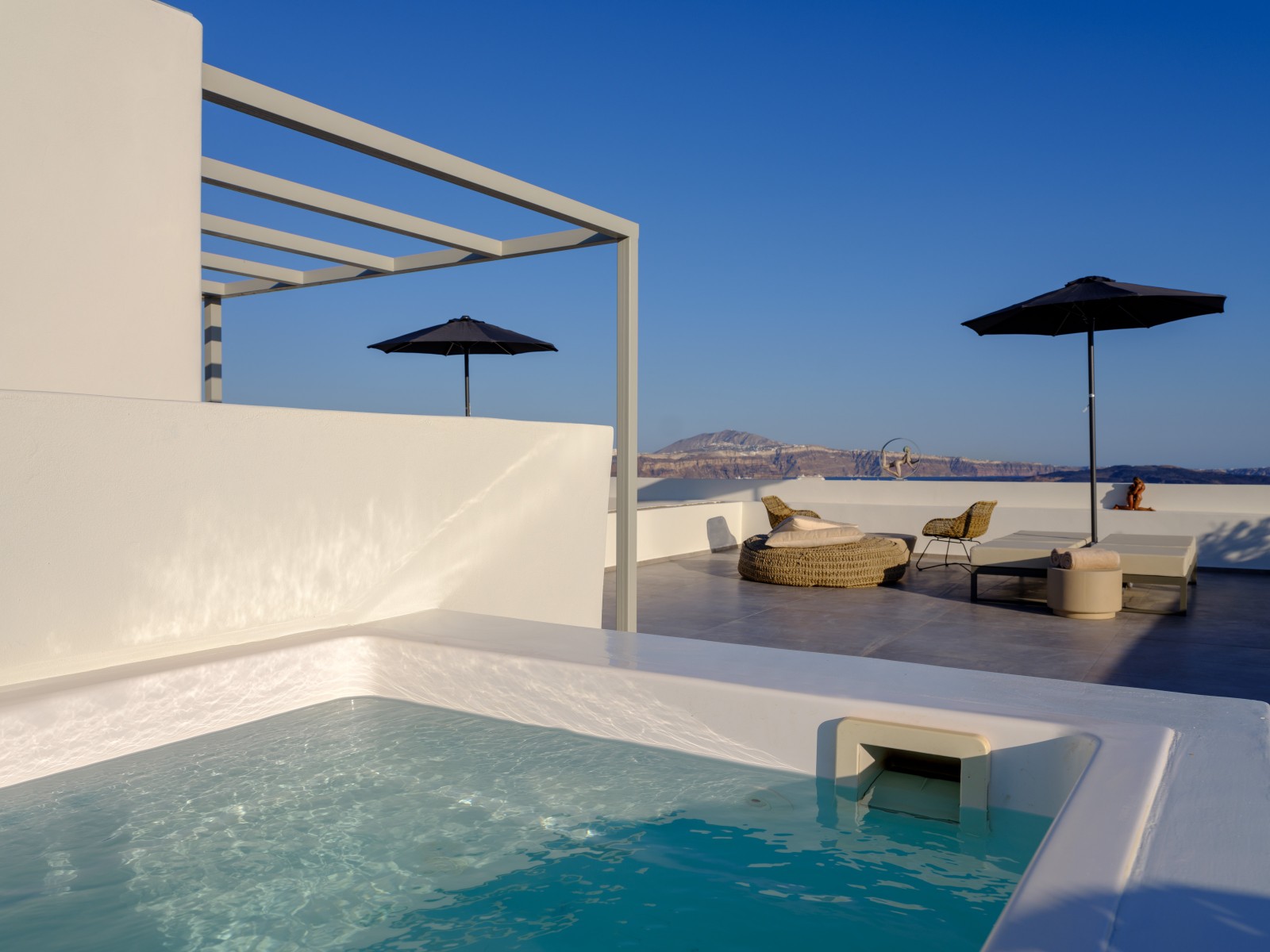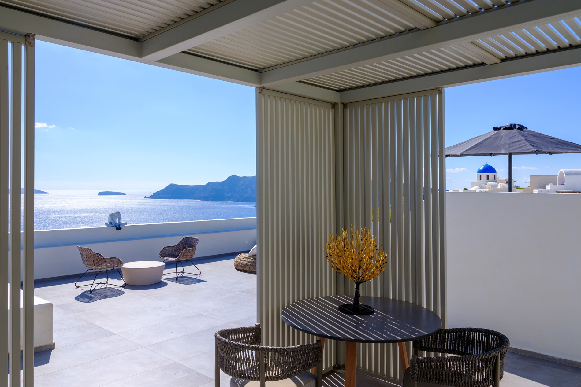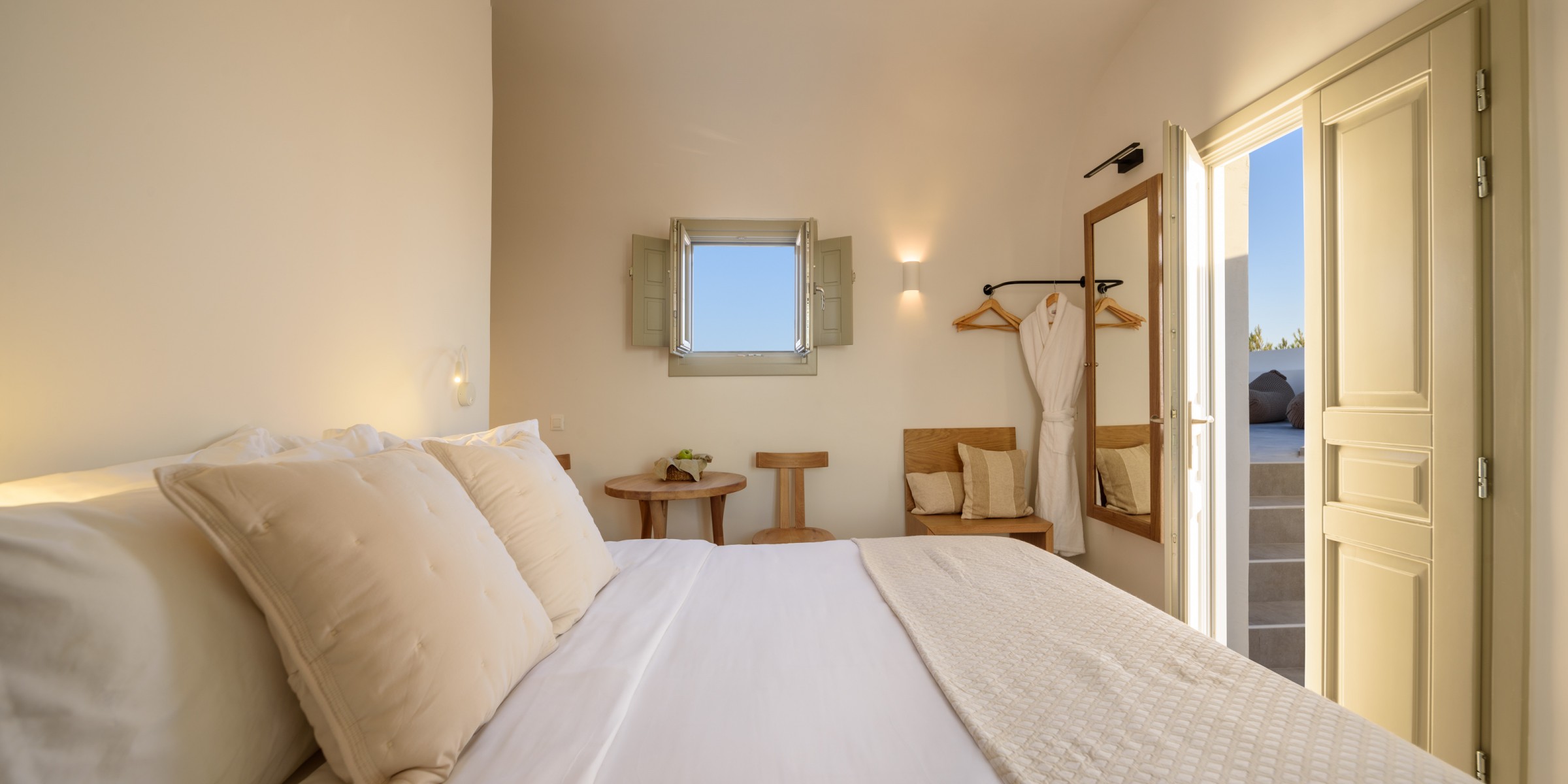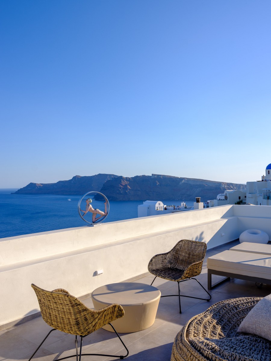 Elevate your escape in the Loft Panoramic Small Suite, where every moment frames Santorini’s iconic spectacle: a dramatic sunset unfurling over the Caldera from your expansive private terrace with outdoor jacuzzi. The compact yet elegant interior creates an intimate cocoon—perfect for two—while beyond its walls, the Aegean Sea stretches infinitely under the glowing sky. It’s not just a stay—it’s your front-row seat to the legendary magic of Oia.
