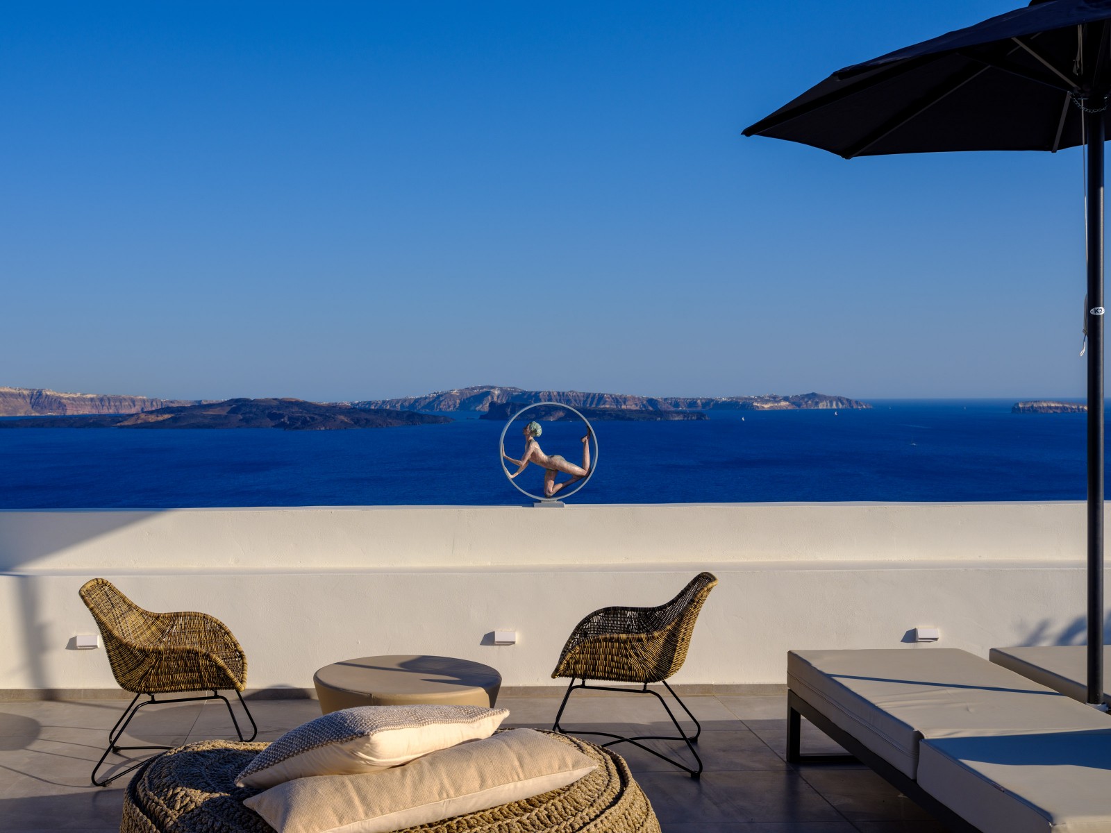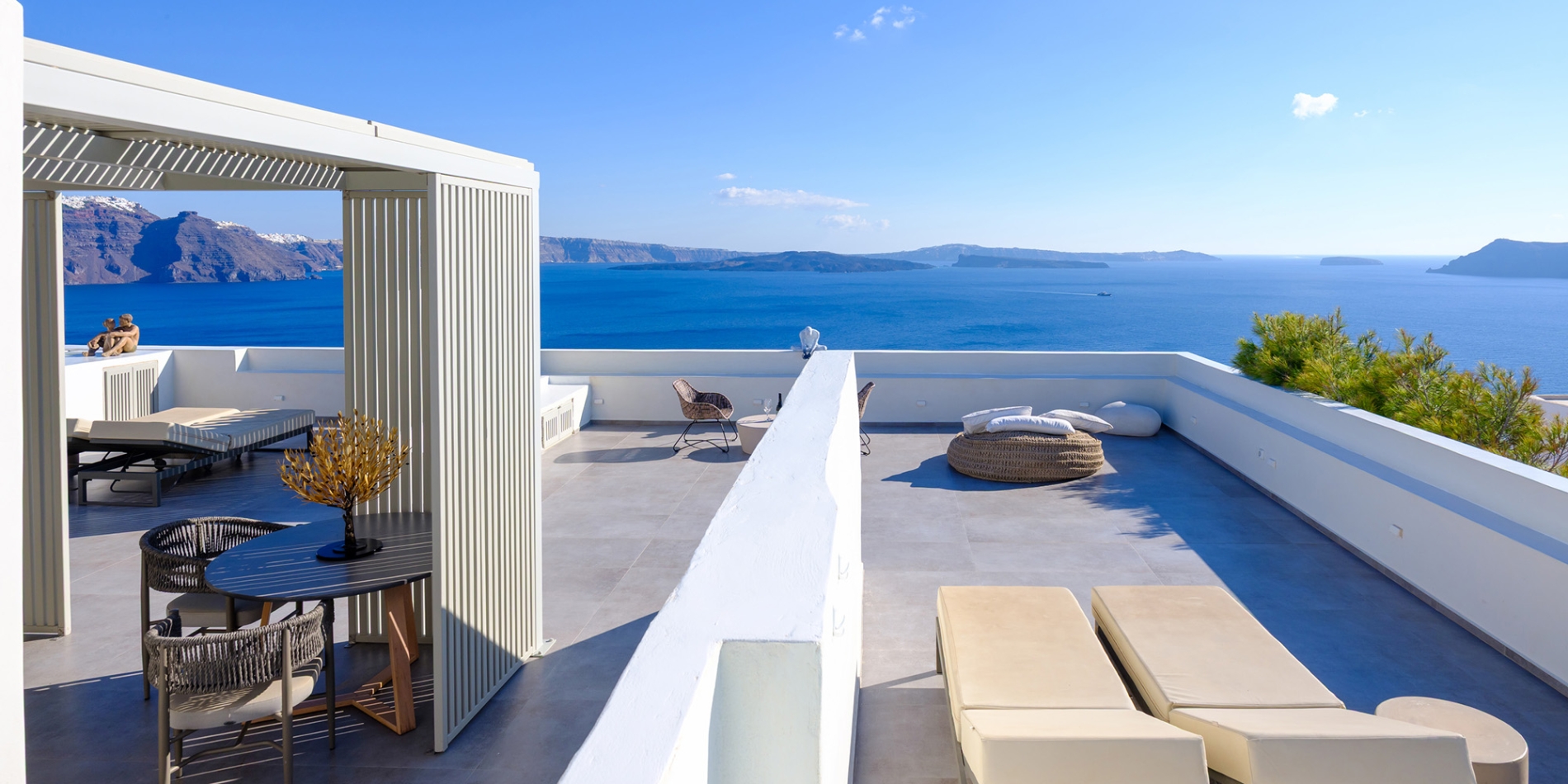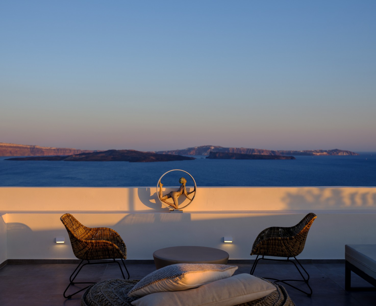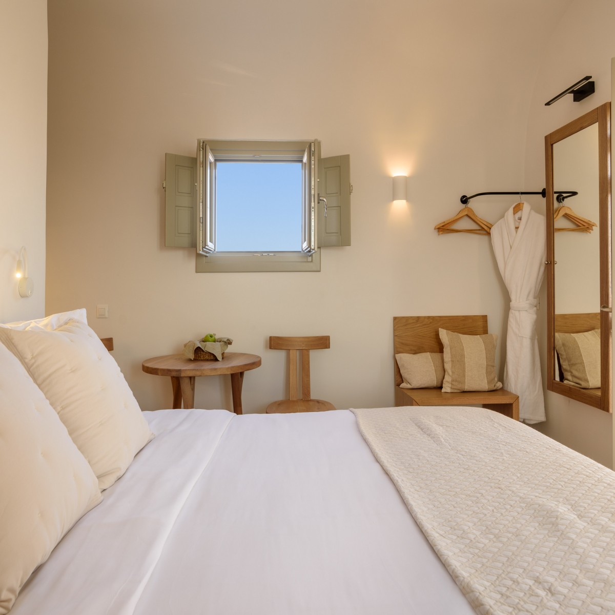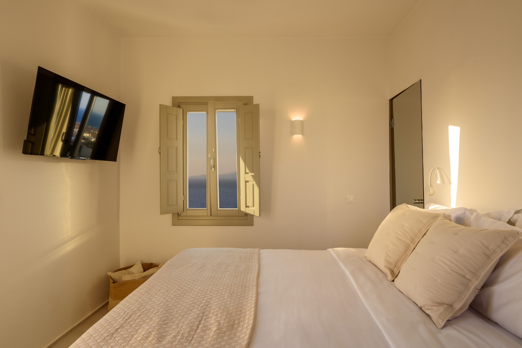 Elevate your escape in the Loft Panoramic Small Suite, where every moment frames Santorini’s iconic spectacle: a dramatic sunset unfurling over the Caldera from your expansive private terrace with outdoor jacuzzi. The compact yet elegant interior creates an intimate cocoon—perfect for two—while beyond its walls, the Aegean Sea stretches infinitely under the glowing sky. It’s not just a stay—it’s your front-row seat to the legendary magic of Oia.